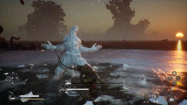 使用冰属性时身体受到多次攻击后会化成冰块假身,与虎先锋的金蝉脱壳相似,此时我们攻击无效,石猿随后会闪现一击,与攻略虎先锋时一样,我们不要攻击等到本体出现,闪避后再追击它。