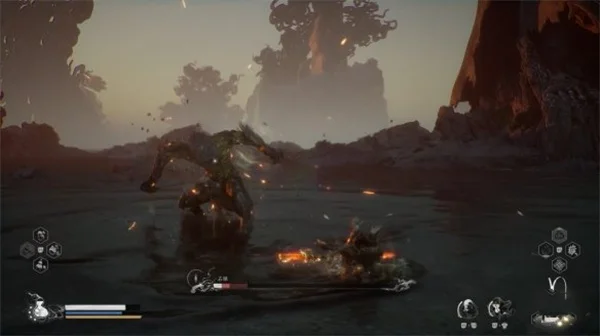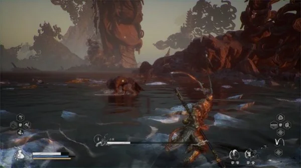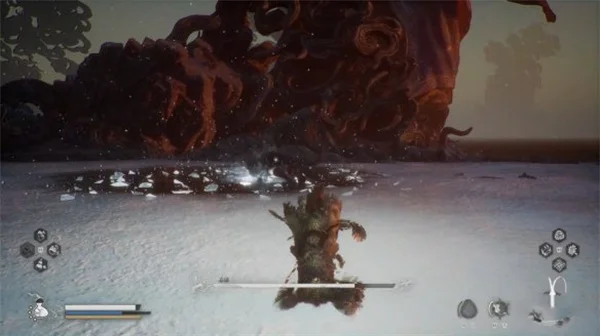石猿锤击地面产生冲击波,总共四次冲击波,最后一次稍微停顿才会出现,这招只需要在他砸地瞬间躲避即可,注意此时不要进行蓄力棍,容易被打断。