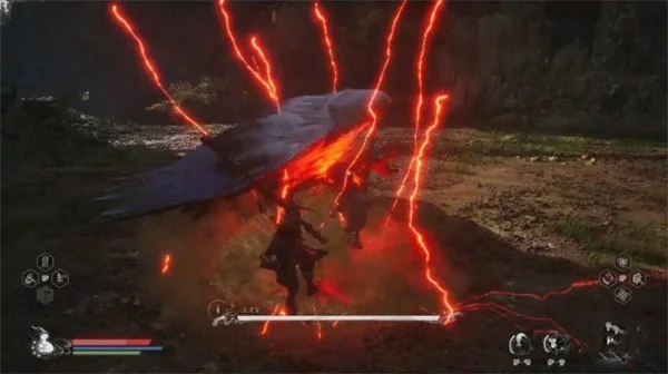 王灵官一脚踹向天命人,速度很快就跟位移一样,出招时用铜头铁臂弹反就可。与王灵官距离稍远时会使用羽毛射向我们,这招会配合踢击后使用,速度不快,比较好躲。