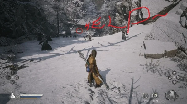 1. 玩家刚下龟岛到达苦海北岸后先向右解锁苦海北岸传送点,从这个传送点出发往左边走,路线见下图,沿着崖壁中间的路到前方房屋处,快到房屋处时会听到前方被怪困住的旅人呼救,击杀周围的怪和他对话,从对话得到他在寻找一种东西红肉黑骨头,谜底是 西瓜 。
