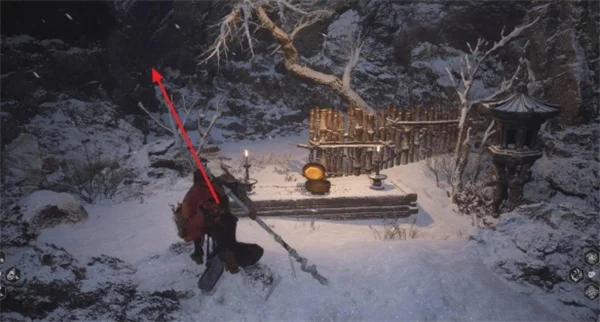 1.从雪山径-照鉴湖篝火出发,走到巨大的冰湖边,会看到一颗被雪覆盖的树,蒲团就在树下。