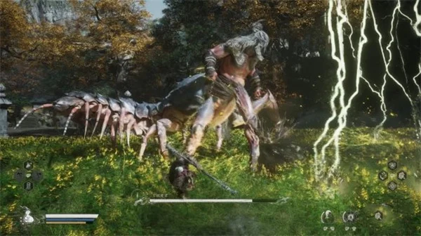 百眼毒君挥动雷符打出三下雷电伤害,紧接着再用剑攻击,百眼毒君的近身攻击很麻烦,有快慢刀,基本上每一刀都会停顿一下再出招,翻滚很吃时机,小编建议滚到百眼毒君的左右两侧比较安全。
