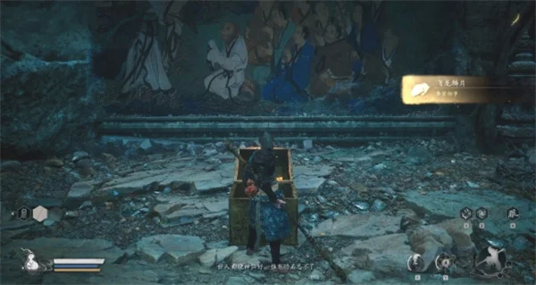5、进入壁画山洞中,前面有一个金灿灿的宝箱。