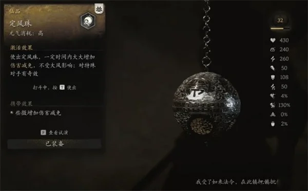 ps: 在黄风大王释放强力的风系技能时,定风珠可以让玩家无视飓风影响,使黄风大王出现硬直,从而给玩家提供输出的机会。定风珠在猪头NPC任务那里,做完就可以领取,任务属于黄风大圣的隐藏支线任务。