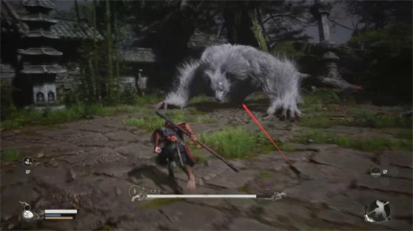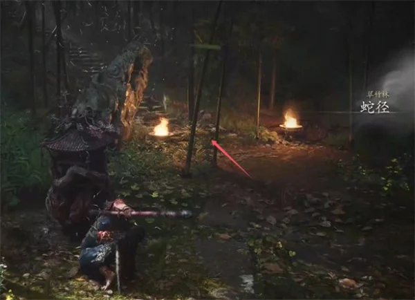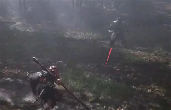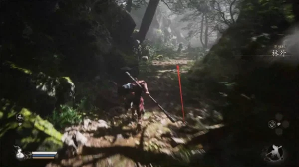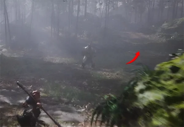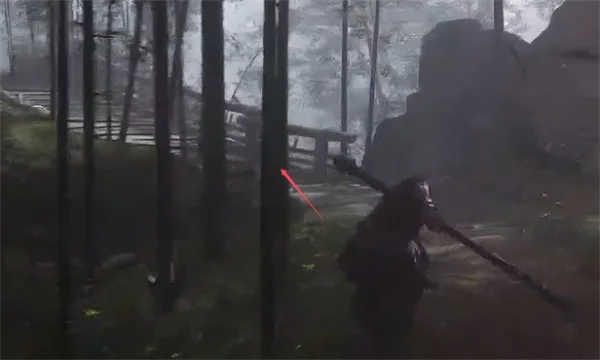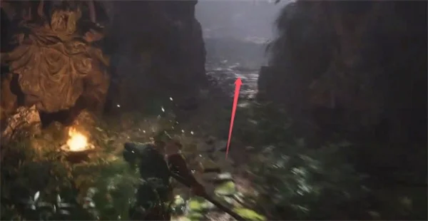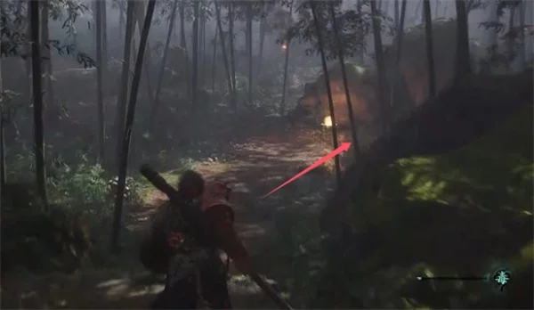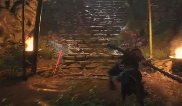 4、通过后,玩家将会看到一个正在燃烧的塔,就在这个位置黑熊精将会出现。