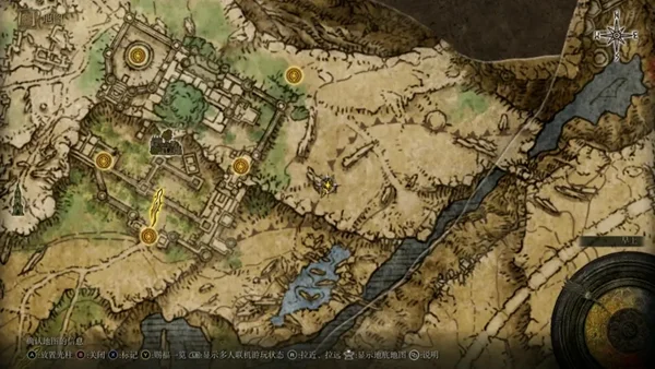 可以看出图中所画有墓碑、卡利亚学院和一颗小黄金树,观察高度、学院和黄金树相对位置,可以判断大致位置,是在卡利亚城寨方向,传送到卡利亚城寨(后方)篝火,再到如图位置,可以找到画家,奖励为泪滴腺体和年幼学徒套(月之女王boss房小怪)