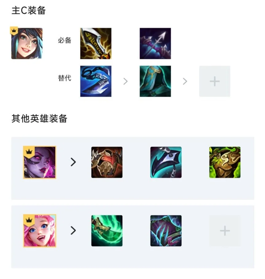 主C刀妹,无尽,巨杀必备,第三件看情况出,外面控制太多就水银,有神佑面纱就可以换轻语更暴力。有三名流就不需要吸血装了。