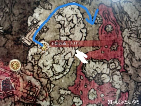 从王朝陵庙(入口)篝火往回走,走到土地上立刻骑马,根据我画的蓝线一直骑马冲,路上遇到什么都不要管,这里有极其强力的怪,被打中必死。一直冲到我画白线的位置,这时候会强制下马,无名的白面具马上就会入侵我们。这时候下马后我们要往回跑,一定不要拉到前面血池里的鸟的仇恨,不然必死。往回也不要跑太多,此时我们有时间可以快速清理一下身后比较碍事的小怪,开辟安全的战场。剩下的就是打,无名的白面具本身并不厉害,单挑我们有很大胜算。记住能杀死我们的只有旁边的小怪。啥死之后我们会的到一个唤勾指药。下图图1为被入侵位置。图2为路线。