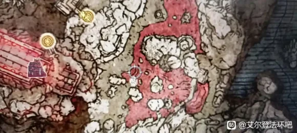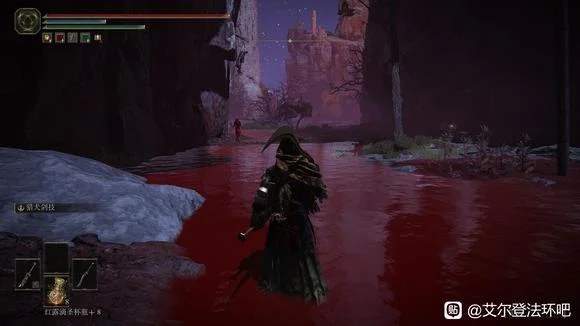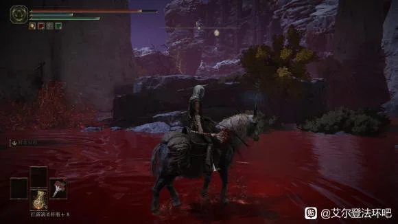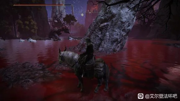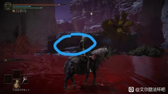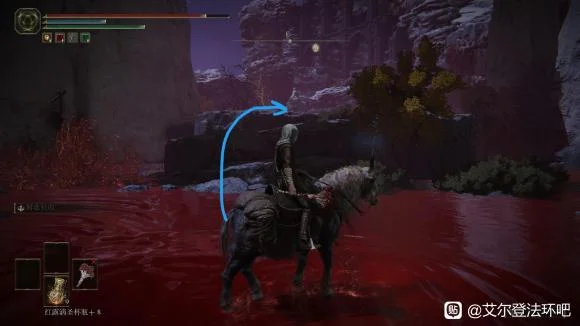 解决完第一次入侵,我们便可以骑马进入整片血池探索。里面的光点大部分都是好东西去,发亮的草一般就是有名骨灰+8的素材了。在绕了几圈后我们不难发现这里有一个黄金种子,这个就是第二次被入侵的位置,如下图。这次入侵条件非常苛刻,一定要踩在去黄金种子前的台阶上,如图二位置,图三为原图。还是以强制下马为信号判断是否被入侵。此时我们已经拉倒了旁边鸟的仇恨,一但强制下马,立刻回头跑回到第一次入侵画白线的位置,由于领地机制鸟并不会追过来,过一段时间第二个无名白面具就跑过来了,我们便可将其轻松击杀。仍然是获得唤勾指药一个。