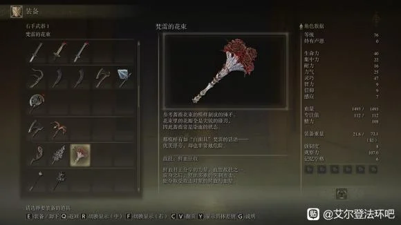 经过对话(大意就是向蒙格祈求力量,蒙格却没有回应),白面具死亡,获得六个溃烂血指和梵雷的花束。下图为梵雷的花束物品描述。