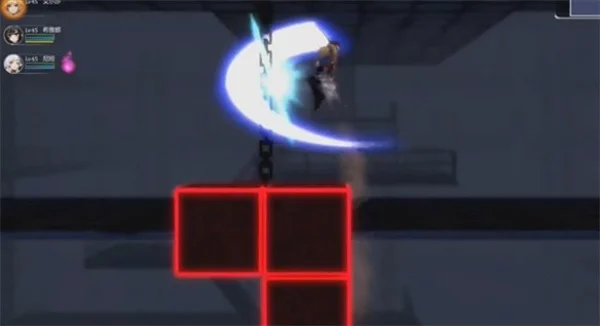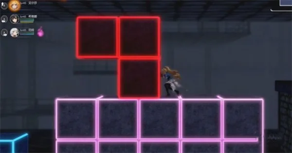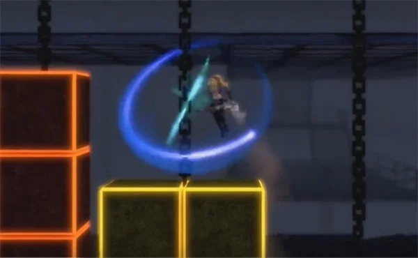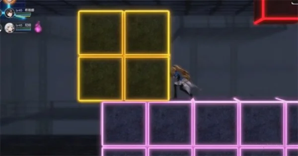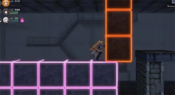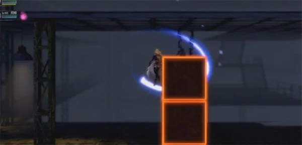 3、第二步,我们先用一个二段跳贴近橙色方块,然后利用攀爬跳跃跳过橙色方块来到蓝色方块上方。