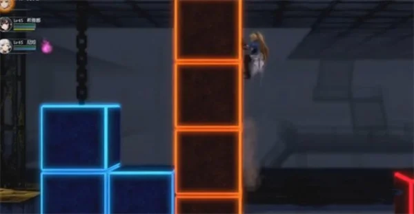 2、第一步,我们首先跳上黄色的方块将铁链打断,打断后将黄色方块向左推下去。
