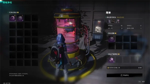 2. 放置“星尘谐振转换器”后,玩家可以将收集来的异界回响放入“星尘谐振转换器”中,右侧会显示本次领地净化的基础信息包括:难易度,净化防守时长,净化容器,净化产物等。
