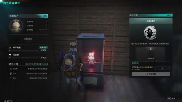 左侧为异常物基础信息与异常物收容环境。达成收容环境条件可以加速该异常物的能量恢复与活跃度。