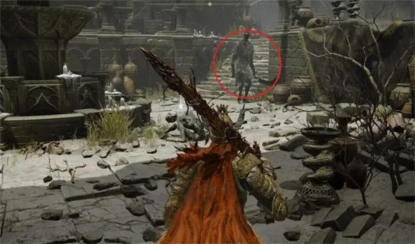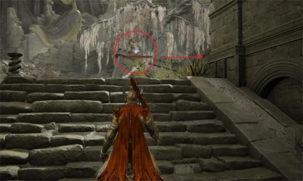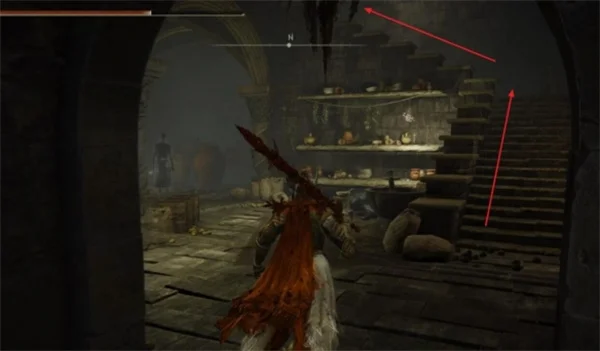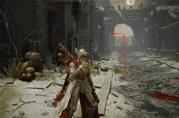 6.走出房间会遇到拿着双大刀的敌人,注意不要被卡在楼梯上直接被秒,击败敌人直接往右走,经过一段废墟会到达一个较大的区域。