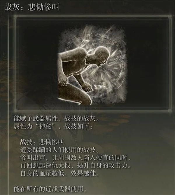 在开放世界角色扮演游戏艾尔登法环黄金树幽影中新增了许多战灰,可以搭配武器使用,其中有一个战灰为悲恸惨叫战灰,部分玩家不知道如何获取,下面就为大家带来艾尔登法环黄金树幽影中悲恸惨叫战灰的获取方法,有需要的玩家可以参考。