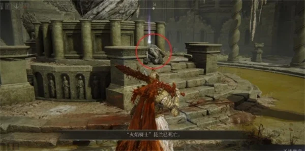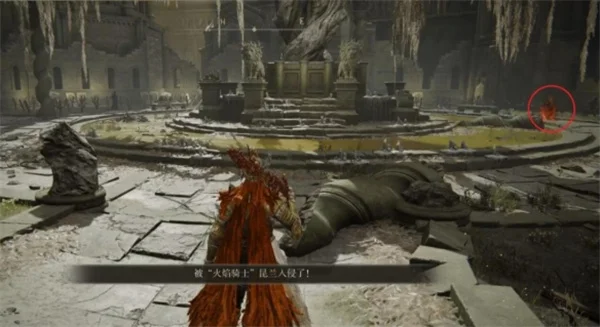 7.这里会出现一个入侵的“火焰骑士昆兰”,总体来说难度不高,使用亵渎圣剑的轮椅组合可以轻松击败,击败它可以获得护符【圣战徽章】。