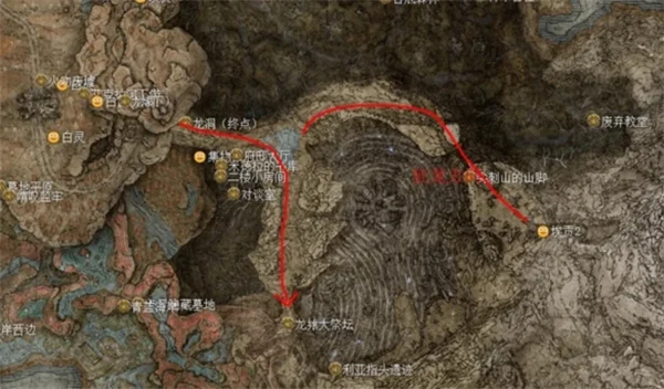 4. 在之前的龙洞(终点)赐福点往尖刺山的方向走,通过一些上升气流向上一路走,接续一路往山顶跑,尖刺山最上面抵达boss狂龙贝勒的战斗地点。