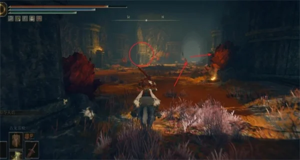 1、首先我们需要从赐福点出发,一路走就能看到右侧的劳弗古遗迹入口,我们进入遗迹一直走到尽头,再往右走就能看到大门;