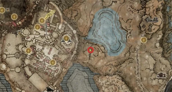 2.找到这幅画后,从墓地平原三叉口的十字记号赐福往西北走,经过一片湖区,到达下图圆圈所示的水边往西南方向看。