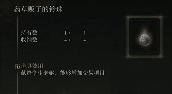 3. 药草贩子的铃珠的作用是交给在大圆桌的双子老婆婆后可以增加店里的商品。