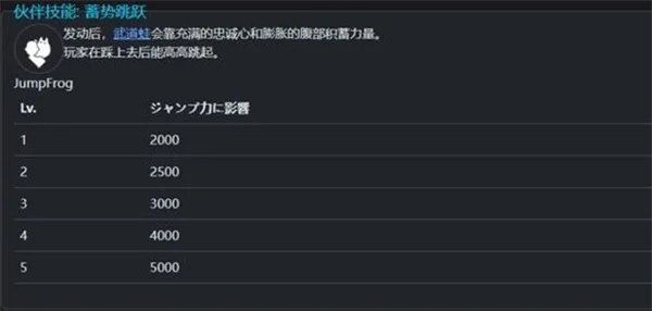 发动后,武道蛙会靠充满的忠诚心和膨胀的腹部积蓄力量。玩家在踩上去后能高高跳起。