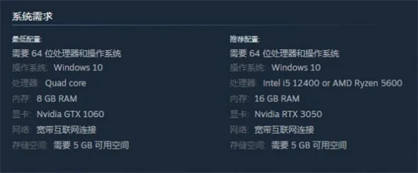 除了显卡外,还需要5GB的存储空间,目前上线了免费试玩版本,可以体验一部分的任务和一个有限区域。
