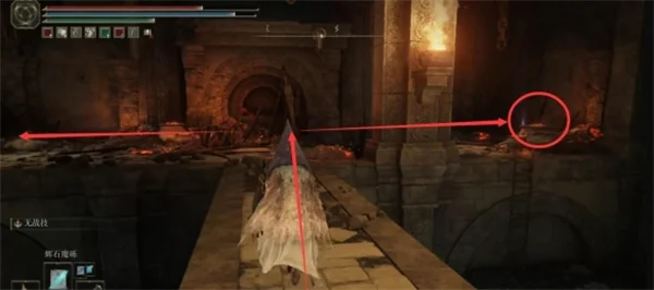 玩家在进入遗迹后,需要先过桥,然后在流纹矛就在右边如下图。