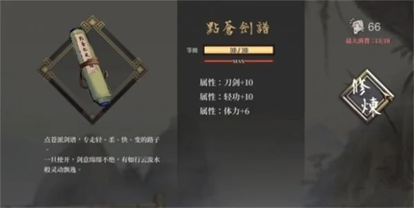 点苍剑谱,是51-75点的奖励,这个秘籍的作用是提升刀剑和轻功,还加了体力,武器流最爱。