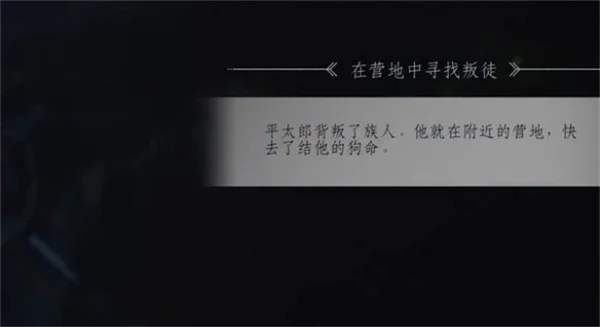 来到生还者营地,主角询问各个NPC,得知有一个平太郎,但是他表示自己没有背叛营地,要和主角在外面说。
