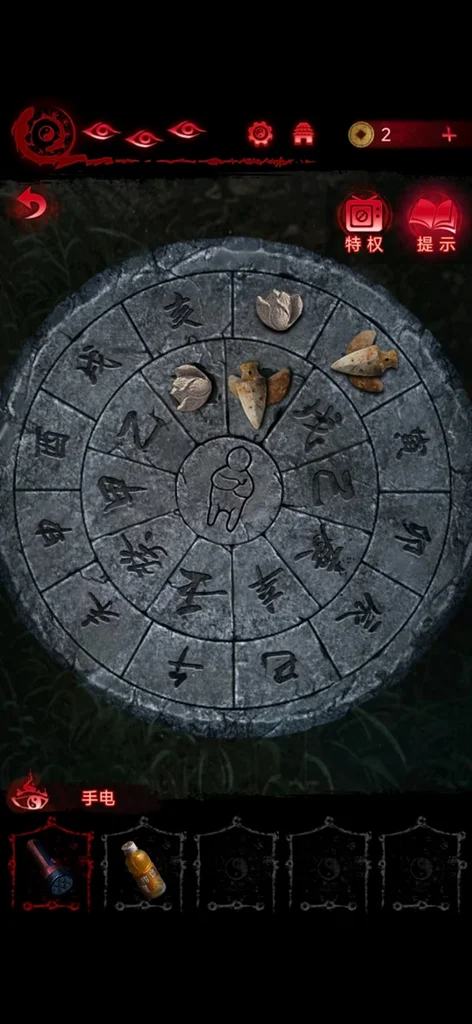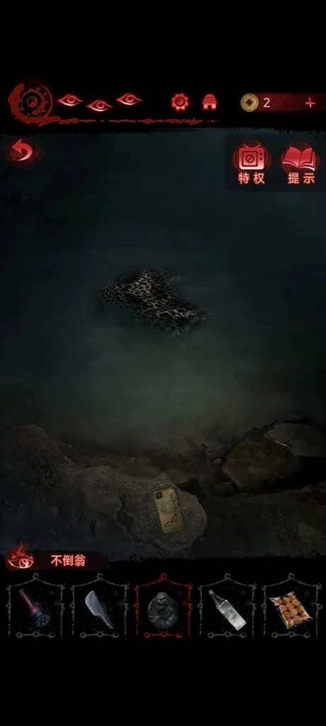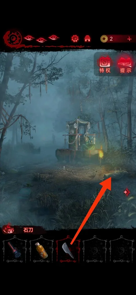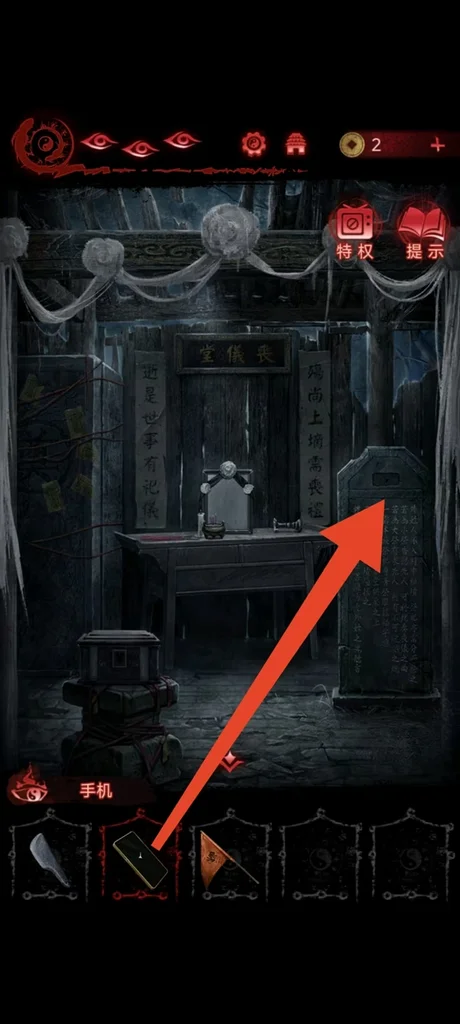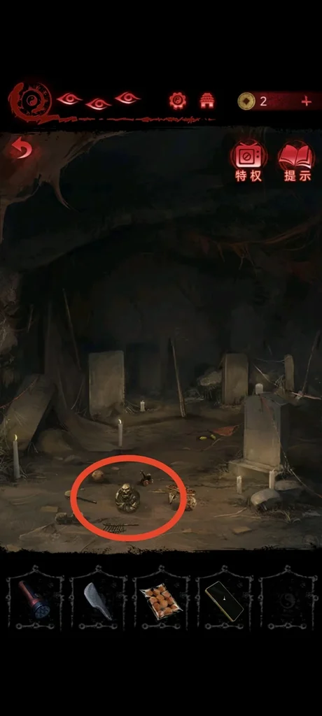 1、地上的背包获得手电和饮料后进入右边坟地,手电照墓碑获得线索。