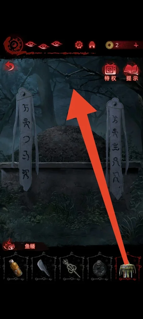 4、来到墓地,把鱼幡挂上钩子,获得提示如下图