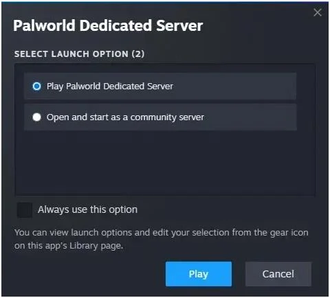 启动后,会出现如下对话框【选择播放Palworld专用服务器】,然后按play。