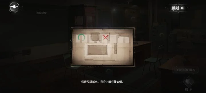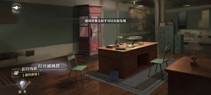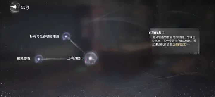 先把所有线索收集齐,不要走门,集齐之后点开线索,得到第一张图,点击提交线索得到第二张图,左下角出现通风管道,点思考得到通风管道为正确道路,进入管道,成功逃脱。