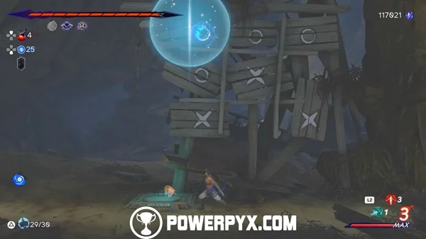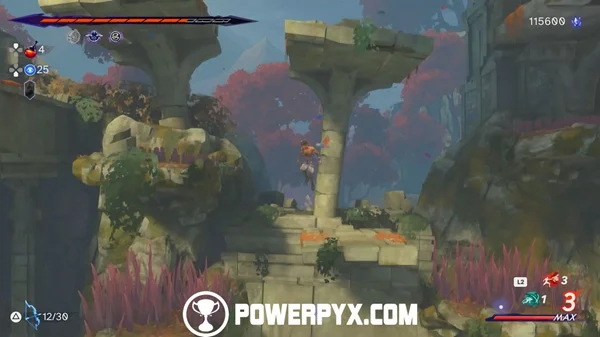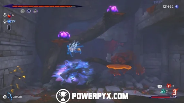 要解决这个谜题,你必须再得到两个雕像。第一个在你上面。转到左侧并向上跳跃。使用你的次元爪并将其浸泡在其中。
