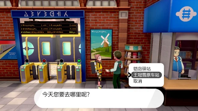 游戏更新完毕之后进入宝可梦世界,会提示前往王冠雪原的提示,因为我们活得了王冠车票了,跟上次前往铠之孤岛的方法一样,找到木杆镇的车务员就可以前往王冠雪原了