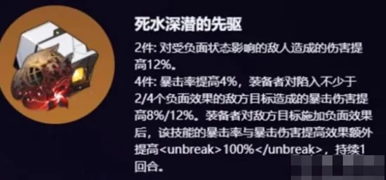 4件套效果:提升4%暴击率,对携带2/4个负面效果的敌人造成暴击伤害时,提升8%/12%的伤害,如果对敌方施加负面效果,则暴击率和暴击效果额外提高100%,持续一回合。