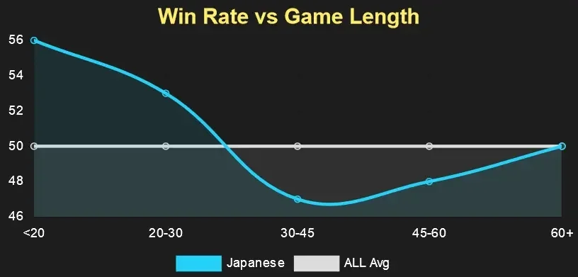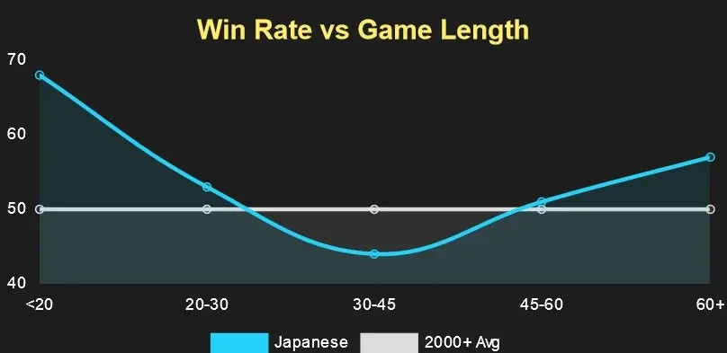 全分段胜率和2000+胜率虽然数值有所区别,但趋势大致保持一致,早期和前期胜率高,中期掉到50%以下,大后期有所回升。其原因可能是前期得益于早期享受到的文明加成,中期缺乏强力兵种,后期则是有优秀的矛叉。