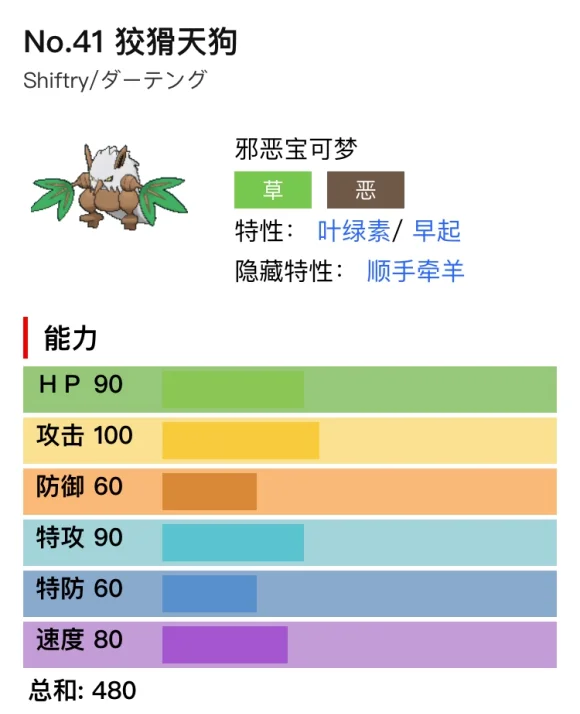 与乐天河童对应的版本限定宝可梦,叶绿素特性也和鸭神悠游自如特性相对应。可是鸭神在雨天队是一哥二哥的存在,而狡猾天狗则。。。。还是先看配置吧:
