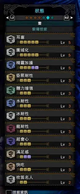 因为煌黑龙是全属性怪,所以我们需要把属性耐性全部提升到20以上,我这套配装选择的是吃属性耐性大的猫饭(6个蔬菜食材),为了防御高一点,用mod锁了“短催”猫饭技能。具体防御面板如下图(前者多吃了个忍耐药丸,推荐在怪物放大招时候吃)