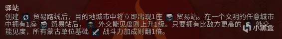 之前关于战斗技巧已经讲过外交能见度和战斗力加成的关系,这里不再复述,而蒙古能够在连商路瞬间出现贸易站,就意味着我们只需要在开战前先和要开战的文明连上商路,再对其宣战。我们的单位与该文明战斗时会+6攻击力,是非常强的征服向能力。