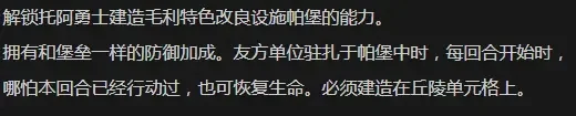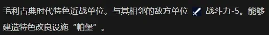 造帕堡虽然废但是能砍树啊。再说-5攻意味着你的其他单位打这个单位也是有5点加成的,防御能力非常强,不怕枪兵所以比战象还恶心人。但问题是攻城和受到远程攻击是没有加成,所以如果把毛勇当做中期征服的主力单位还是算了吧,打征服出几匹马有用多了。