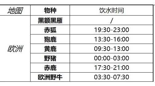 在猎人荒野的召唤中每个区域的动物都有着饮水时间,玩家可以在熟记自己想要狩猎的动物饮水时间后在特定时间进行蹲点,下面就为大家分享全生物饮水时间自查表,供各位玩家们参考。