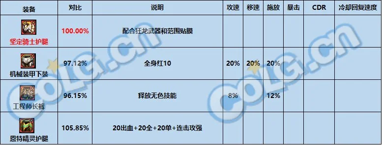 配合狂龙武器下最高提升率的裤子,并且裤子可以即时叠满狂龙武器的范围增加属性,在全身红10情况下,与机械裤子+制式武器的对比提升率几乎一致,并且额外增加75,80技能5%技攻,对于9保技能的角色提升更高。