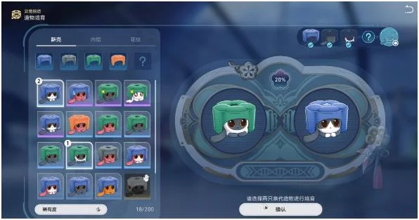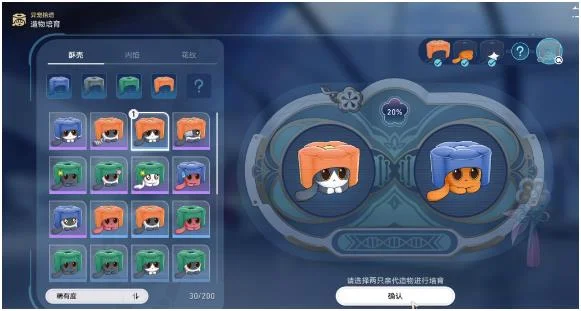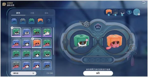 5、选择对应特征的两只,要是:蓝色的酥壳、灰色内陷、白色花纹点击即可培育;