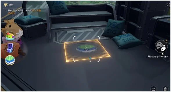 2、完成【休息区】和【进食区】布置,在休息区中喷射上【枕头】涂鸦,在晶石区喷上【果盘】涂鸦;
