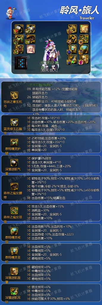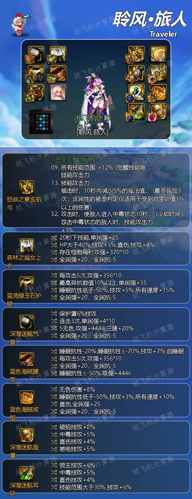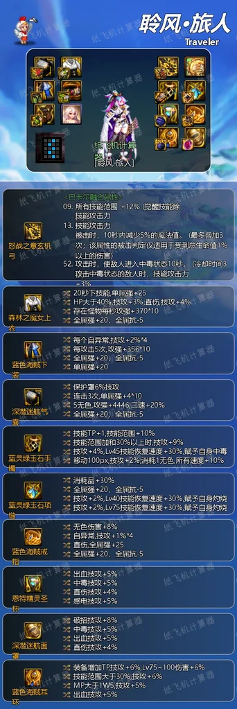 适合进阶级旅人玩家。强度来源于改版后的蓝灵手镯和新自定义海贼耳环。核心为手镯和耳环。注意:深潜肩膀的护盾6%技攻需要搭配仙20的天赋才能触发。