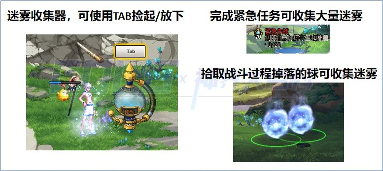完成紧急任务或收集战斗过程中掉落的球,可收集迷雾。