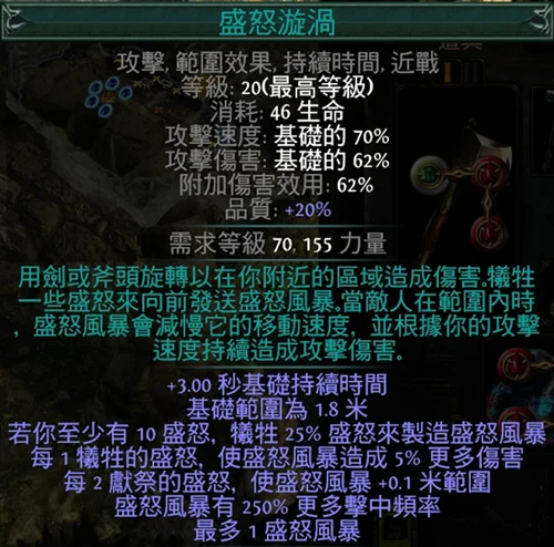 改造版,62%伤害倍率,0.7攻速,漩涡250%更多攻击频率,1*0.62*0.7*3.5,约为150%倍率,在近战技能里属于非常低的伤害倍率了,他优点是可以持续输出,边走边打,范围大,而且可以持续享受战吼收益,只能说凑合能玩。