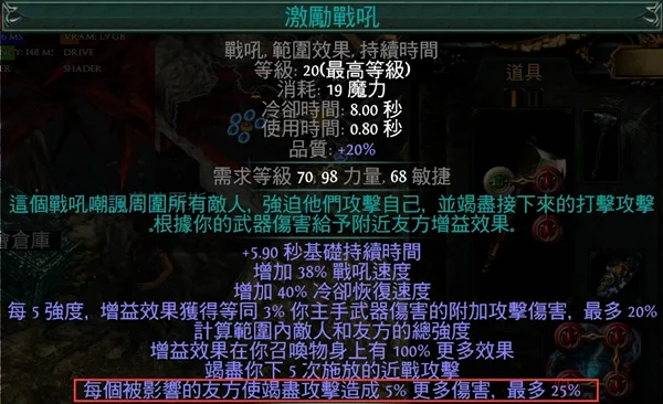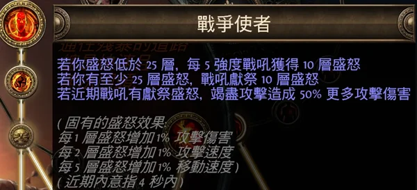 当你怒气高于25点,施放战吼后4秒内,消耗战吼层数的攻击,可获得50%more伤害加成。